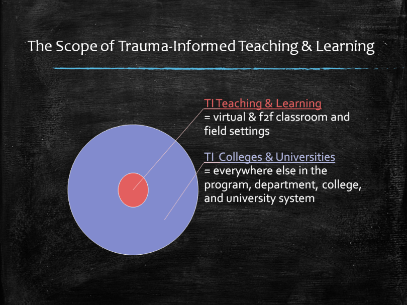 What is trauma-informed teaching and learning? Trauma-Informed Teaching and Learning (TITL) is a term I coined to refer to a trauma-informed approach to college curriculum delivery. To become trauma-informed in the context of college teaching and learning means to understand the role that violence and victimization have played in the lives of students and educators, […]